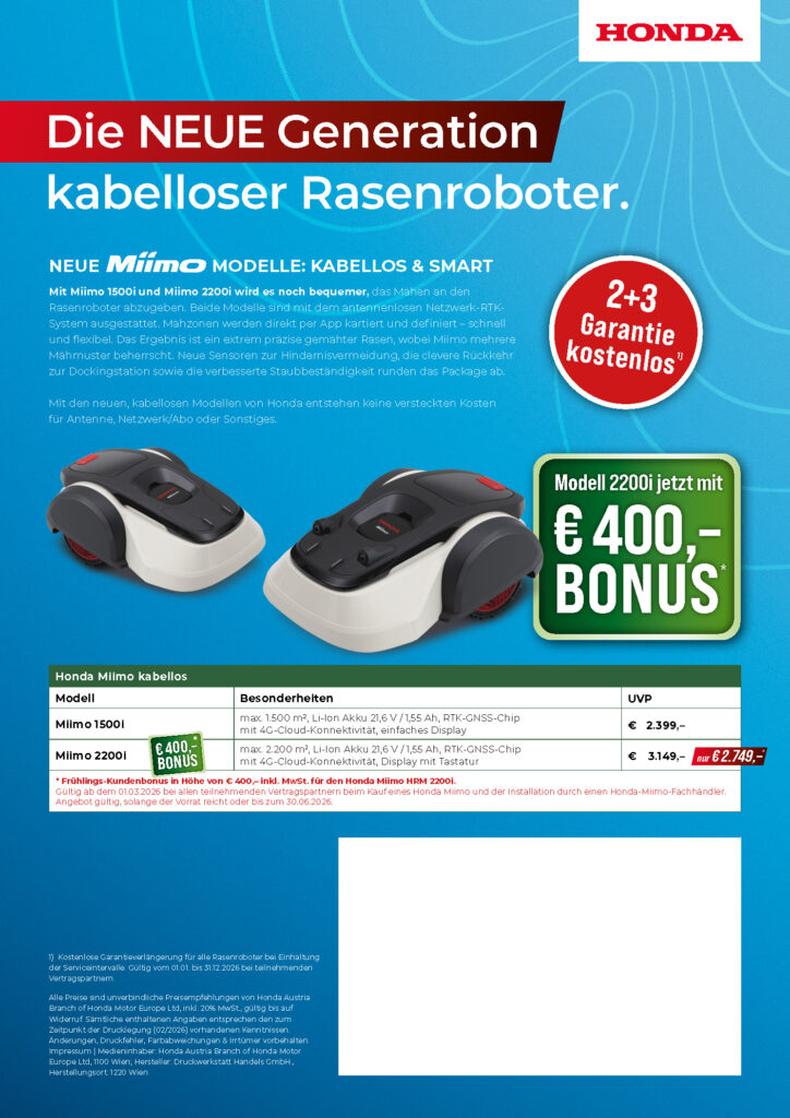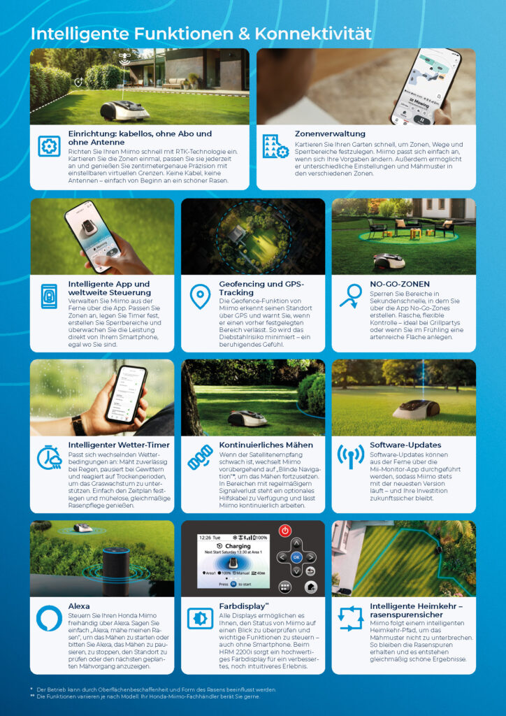 Die Honda Rasenmäher und Rasenroboter zeichnen sich durch Qualität und Langlebigkeit aus. Jährliche Services verlängern außerdem noch die Garantiezeit auf 5 Jahre.